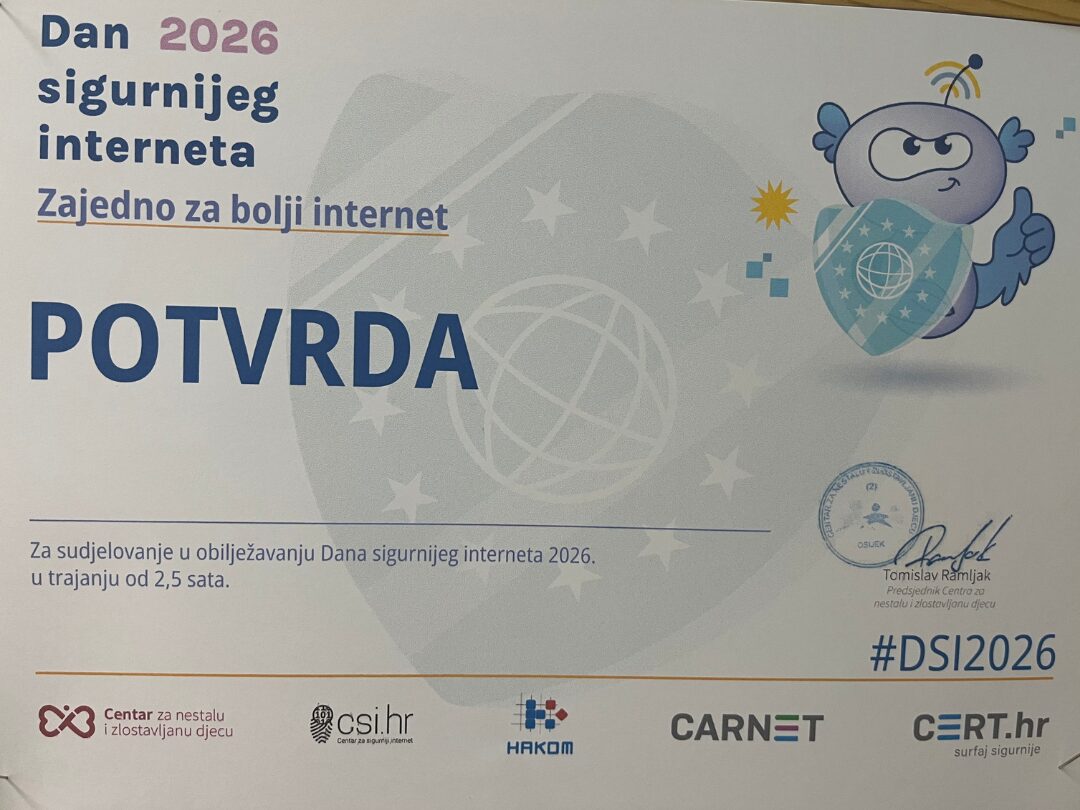 U našoj školi održana je edukativna radionica za učenike razredne i predmetne nastave. Tema radionice za učenike razredne nastave bila je Utjecaj digitalnih sadržaja na emocije i ponašanje djece dok u učenici predmetne nastave sudjelovali u radionici na temu Digitalna samoobrana. Radionice su provedene u trajanju od 45 minuta kroz niz interaktivnih i kreativnih aktivnosti prilagođenih njihovoj dobi.